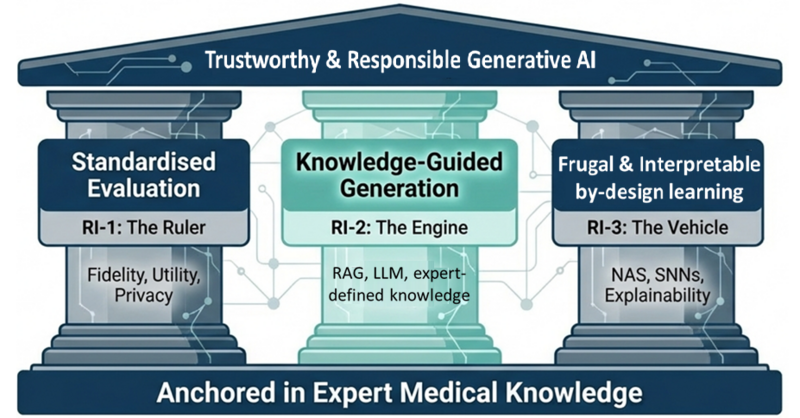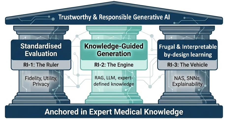 This framework illustrates a structured approach to Trustworthy & Responsible Generative AI, visualized as a classical temple supported by three core pillars and a solid foundation. The structure is Anchored in Expert Medical Knowledge, which serves as the base for the entire system. At the center of the architecture is the middle pillar, Knowledge-Guided Generation (RI-2: The Engine), which utilizes RAG, LLM, and expert-defined knowledge to drive the AI's output. To its left stands the pillar of Standardised Evaluation (RI-1: The Ruler), focusing on the metrics of Fidelity, Utility, and Privacy. To the right, the third pillar emphasizes Frugal & Interpretable by-design learning (RI-3: The Vehicle), incorporating technical approaches like NAS, SNNs, and Explainability. Together, these three Research Initiatives support the overarching roof of the structure, representing the ultimate goal of achieving a safe and reliable generative AI system.